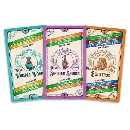 The rest of the Hex cards are shuffled in with the larger deck. Then, deal four cards to each player (concealed in hand). Start your turn by drawing two cards. You can make two actions on your turn. If you have in your hand a Remedy card that treats one of your hexes, you can place it on top of that Hex. You're now closer to winning — but watch out! Every Remedy contains a list of side effects (other Hexes) that you are now vulnerable to receiving from other players on their turns.