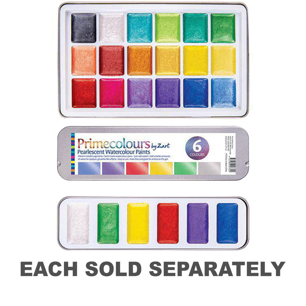 Primecolours Pearlescent Watercolours are vibrant metallic pigments in semi-moist watercolour pans - just add water! These luscious, intermixable semi-wet watercolours -allows the student or artist to enjoy the quality of artist tube paint, but with the convenience and value of a portable palette set. These watercolours are semi-dried, contain less filler and are loaded with metallic pigment, which results in a stronger, clean and more saturated colour.