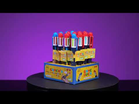 Nivå opp skrivingen din med denne nyhetsgamerpennen! Har pikselikoner med tekst som leser 'spill over'. Med 6 farger å skrive med: svart, blå, rød, oransje, grønn, lilla.