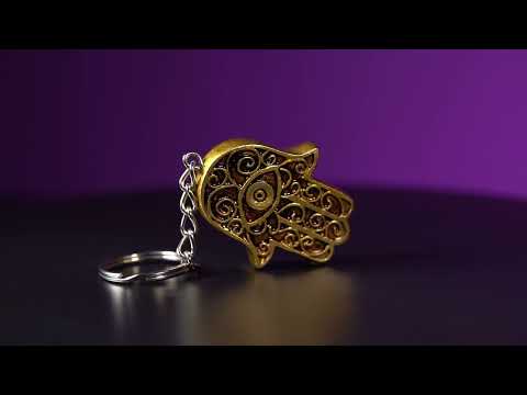 Hamsa de Hamsa pintado à mão mística. Apresenta um intrincado design da Hamsa com um acabamento metálico em um anel tradicional de chaveiro.