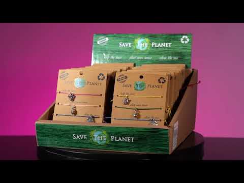 Uppsättning av 3 'Save the Planet' bomullsarmband handgjorda av hantverkare. Har tre symboliska charm; Ett bi, ekollon och fisk. Detta miljövänliga armband är fartyg slumpmässigt mellan livliga färger